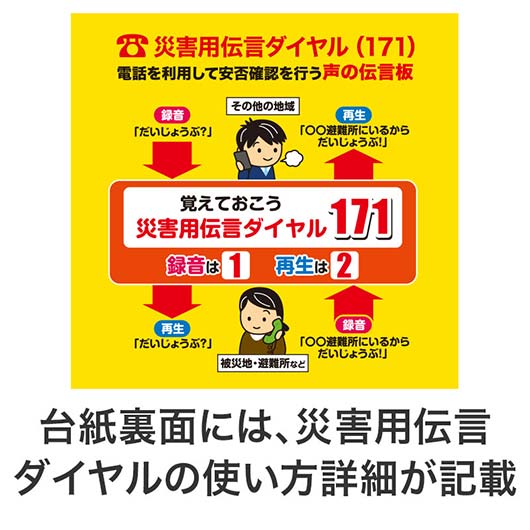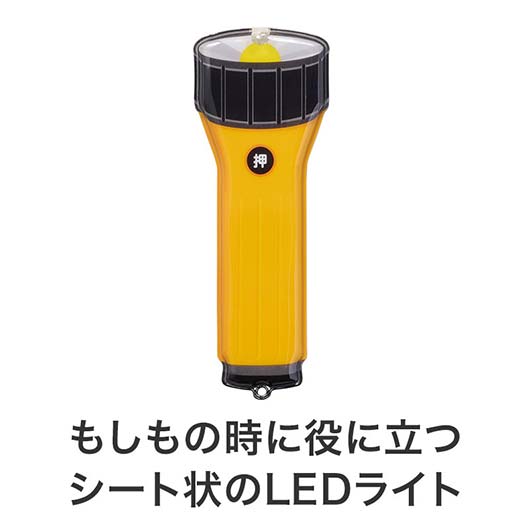 気軽に備えられて、もしもの時に大活躍! 手元を明るく照らしてくれる、シート状のLEDライトです。 マグネット仕様なので、冷蔵庫等にペタリと貼り付けることができます。 ボールチェーンやキーリング等で吊り下げるのに便利な穴もありますので、とにかく身近に備えておきましょう! 本体裏面には災害用伝言ダイヤルの情報を、 台紙裏面には、さらに詳しい使い方も掲載しております。 もしもの時に、心強いアイテムです♪ 表面に名入れが可能で、一般企業・団体様でも、その名称をプリントすれば、 販促効果をもった防災グッズ、一粒で二度美味しいアイテムが完成いたします! 受け取った方が身近に備えていただければ・・・継続的で大きな販促効果も期待できます。 防災訓練をはじめ、消防・救急の各種イベントで参加賞・配布品として、是非ご活用ください。 ※電池交換はできません。電池が切れた後はマグネットとしてご活用ください。