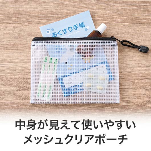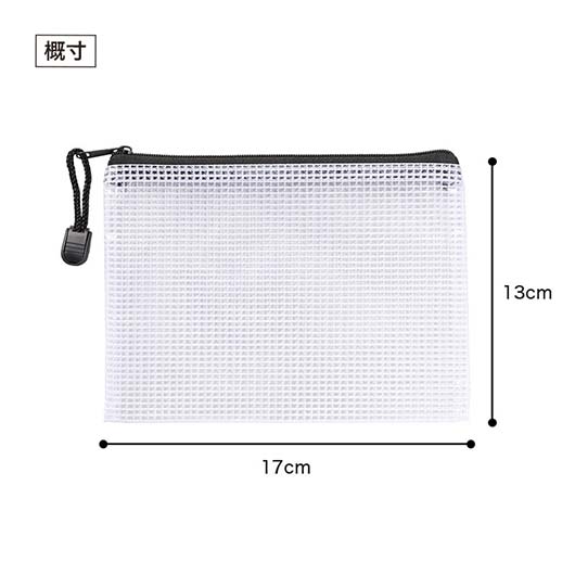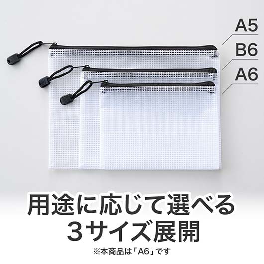 両面メッシュタイプのクリアポーチです。 通帳や印鑑等事務用品、カードやレシート・小銭等の収納にぴったり! 中身が見えて使いやすく、シンプルなデザインでご利用頂く方を選びません。 つまみ部分もしっかりとした形状・サイズで、シニアの方や小さなお子さまでも安心です。 PVC(ポリ塩化ビニル)素材のため汚れも楽に拭き取れます。 名入れも可能で、本体がシンプルなだけに、PR効果は抜群です! 本商品はブラック・A6サイズですが、 他カラー・サイズも各種取り揃えておりますので、あわせてご検討ください。