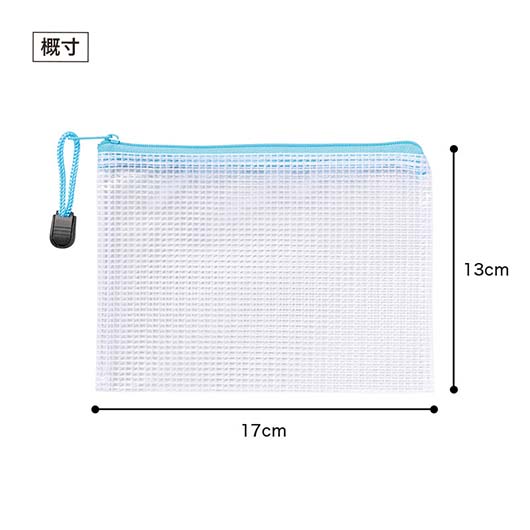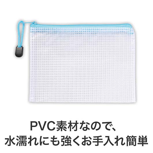 両面メッシュタイプのクリアポーチです。 通帳や印鑑等事務用品、カードやレシート・小銭等の収納にぴったり! 中身が見えて使いやすく、シンプルなデザインでご利用頂く方を選びません。 つまみ部分もしっかりとした形状・サイズで、シニアの方や小さなお子さまでも安心です。 PVC(ポリ塩化ビニル)素材のため汚れも楽に拭き取れます。 名入れも可能で、本体がシンプルなだけに、PR効果は抜群です! 本商品はライトブルー・A6サイズですが、 他カラー・サイズも各種取り揃えておりますので、あわせてご検討ください。