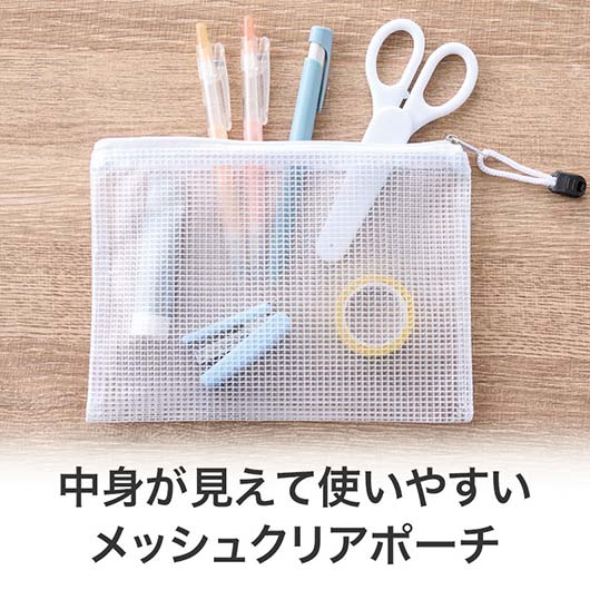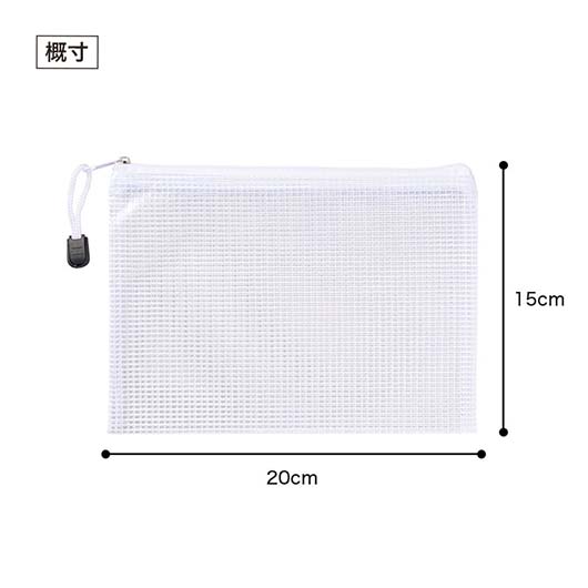 両面メッシュタイプのクリアポーチです。 文房具や小物入れ、バッグインバッグとしても便利です♪ 中身が見えて使いやすく、シンプルなデザインでご利用頂く方を選びません。 つまみ部分もしっかりとした形状・サイズで、シニアの方や小さなお子さまでも安心です。 PVC(ポリ塩化ビニル)素材のため汚れも楽に拭き取れます。 名入れも可能で、本体がシンプルなだけに、PR効果は抜群です! 本商品はホワイト・B6サイズですが、 他カラー・サイズも各種取り揃えておりますので、あわせてご検討ください。