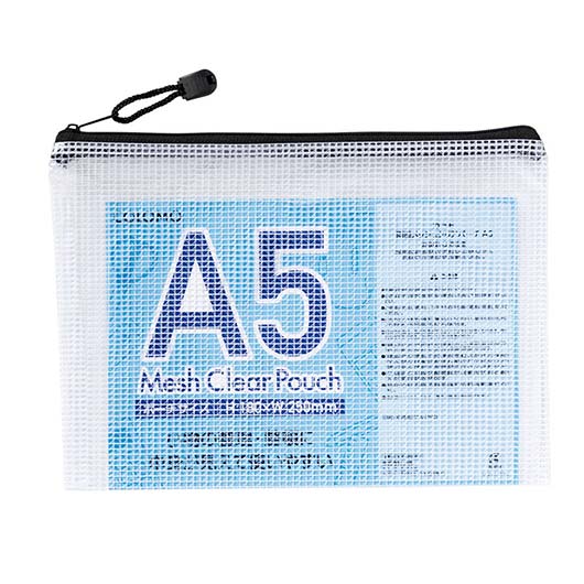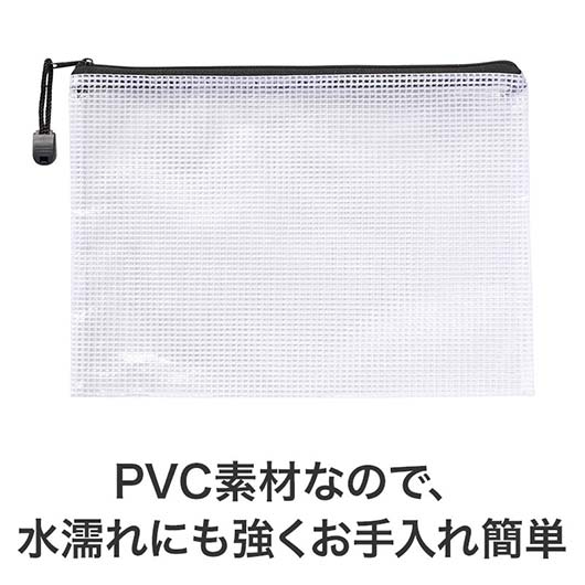 両面メッシュタイプのクリアポーチです。 化粧品や洗面用具等の持ち運びにぴったりで、トラベルポーチとしても活躍します。 中身が見えて使いやすく、シンプルなデザインでご利用頂く方を選びません。 つまみ部分もしっかりとした形状・サイズで、シニアの方や小さなお子さまでも安心です。 PVC(ポリ塩化ビニル)素材のため汚れも楽に拭き取れます。 名入れも可能で、本体がシンプルなだけに、PR効果は抜群です! 本商品はブラック・A5サイズですが、 他カラー・サイズも各種取り揃えておりますので、あわせてご検討ください。