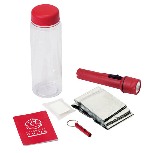 ●サイズ:防災ガイド、ボトルΦ6.5×19.5cm(容量 500ml)、ホイッスル、アルミブランケット約140×70cm、圧縮タオル、ライト