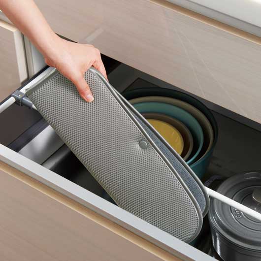 洗った食器の水きりに役立つ吸水マットです。 食器を立てられるスタンド付きで使い勝手アップ。 スタンドは外して折りたたみ収納可能です。
