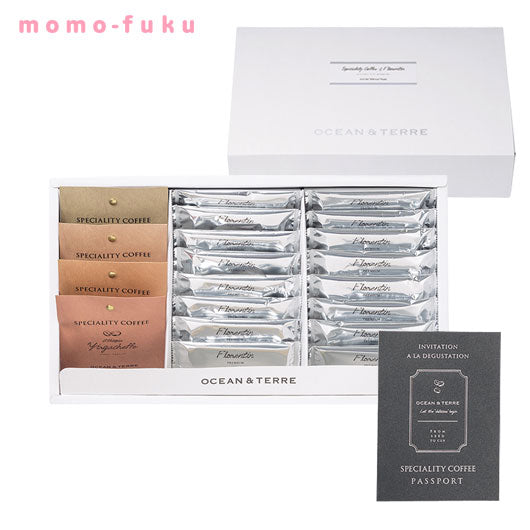 【セット内容】ドリップ珈琲(ミャンマー スターマウンテン、ブラジル ショコラ、コスタリカ ハニー、エチオピア イルガチェフェ)4種(各8g×1)、フロランタン12g×16、パスポート付き(スペシャルティコーヒー説明書)