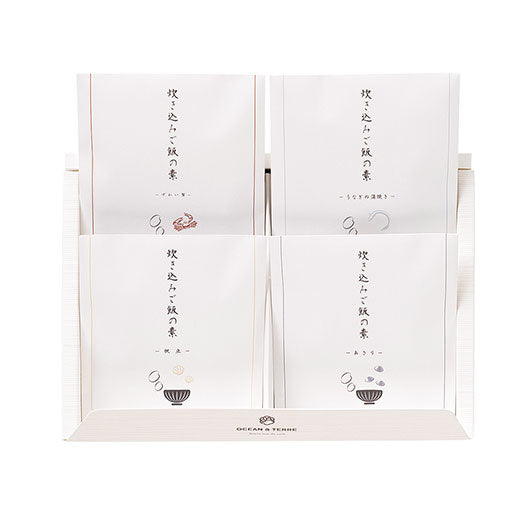 ●内容:炊き込みご飯の素(2合用)38g×4、ずわい蟹13g×1、帆立×1、うなぎの蒲焼き13g×1、あさり30g×1、三つ葉0.2g×4、白煎りごま1g×4