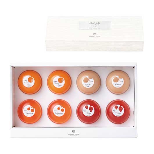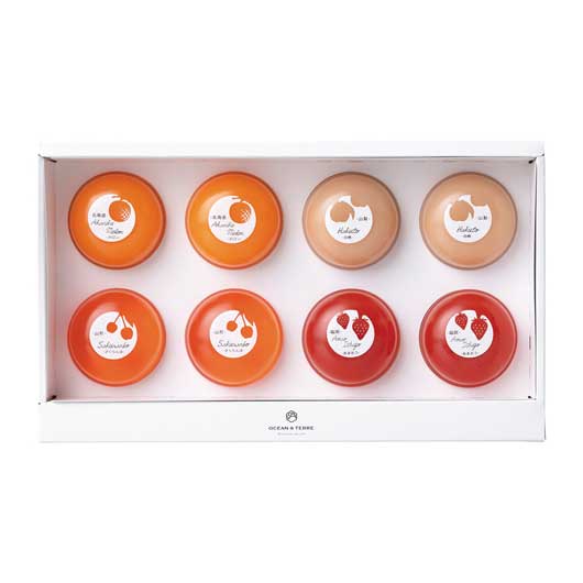●内容:北海道 赤肉メロンゼリー72g×2、山形県 さくらんぼゼリー72g×2、山梨県 白桃ゼリー72g×2、福岡県 あまおう苺ゼリー72g×2