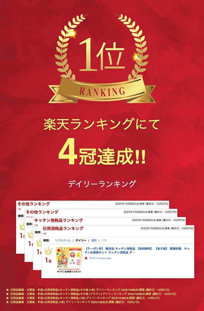 年末年始のギフト、開店・周年記念等でのプレゼントにぴったりな、 キッチンのお掃除に役立つアイテム、詰め合わせセットです。 パッケージの外側からもわかる「縁起物」デザイン尽くし、 もらって嬉しいボリュームあるセットです。 その中身は・・・ ・福だるまのキッチンスポンジ  …自立するので水切れよく衛生的、泡立ちもばっちり♪ ・松竹梅デザイン、3つのメラミンスポンジ  …水垢・茶シブ落としで実力を発揮します! ・ひょうたん形の不織布たわしが3枚  …鍋底や五徳等の頑固な「焦げ」落としにご利用ください。 ・1枚あると、とっても便利なキッチンダスター  …速乾性・耐久性にすぐれ、繰り返し洗って使うのに便利で衛生的! 以上4種(8点)のセットです。 商店街・家電量販店・百貨店・スーパー・ディーラー・住宅展示場と、 どこでもご利用いただける「開運招福」デザインです。 集客・顧客満足度向上にご活用ください。