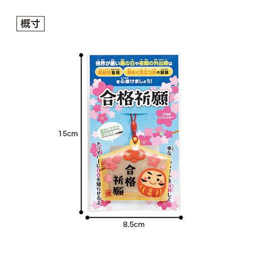 年があけ、1~2月にかけて「受験シーズン」が到来いたします。 新年度・新生活に向け、免許や資格の取得にのぞむ方も増える期間です。 全国の受験生たちを応援する「合格祈願」シリーズにご注目ください。 「合格祈願」と想いを込めたメッセージ、縁起物の代表格「だるま」、 そして受験後の明るい未来を、満開の「桜」イメージでデザインいたしました。 リフレクターとは、自ら発光するものではなく、車等のライトの光を反射、 キラキラ光って、その存在を知らせる交通安全グッズです。 暗い夜道で「もしも」の事故を未然に回避できる可能性を高めてくれます。 受験当日だけでなく、毎日夜遅くまで頑張る受験生にはぴったりなギフトアイテムです。 背面には、実際の絵馬のように、目標を書き込んでいただくこともできます。 受験生が身の回りにいる、学校・塾・地域団体のみなさま、 受験生に寄り添う、宿泊施設・公共交通機関・各企業のみなさま、 彼らを応援する気持ちを込めて、本アイテムをプレゼントしてみませんか? がんばれ!受験生!!