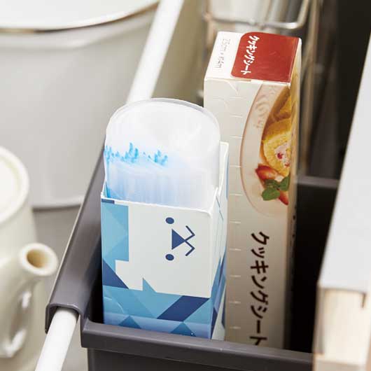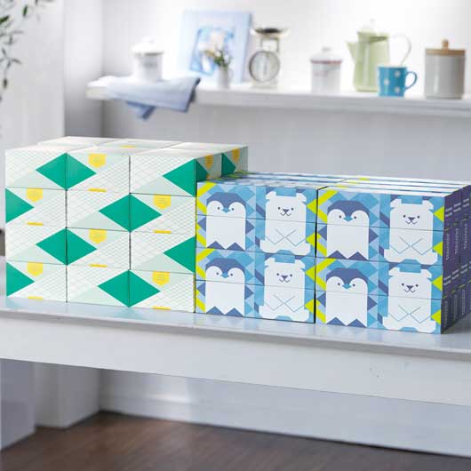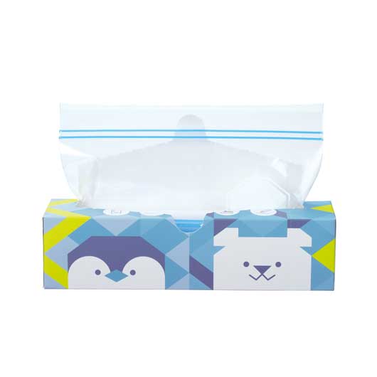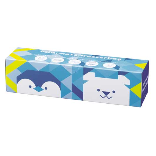食品の冷凍冷蔵などに役立つフリーザーバッグ。 置き場所に合わせて2種の開け方ができ、 箱を積み上げるとペンギンとシロクマが座ります!