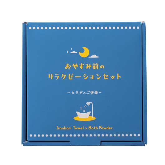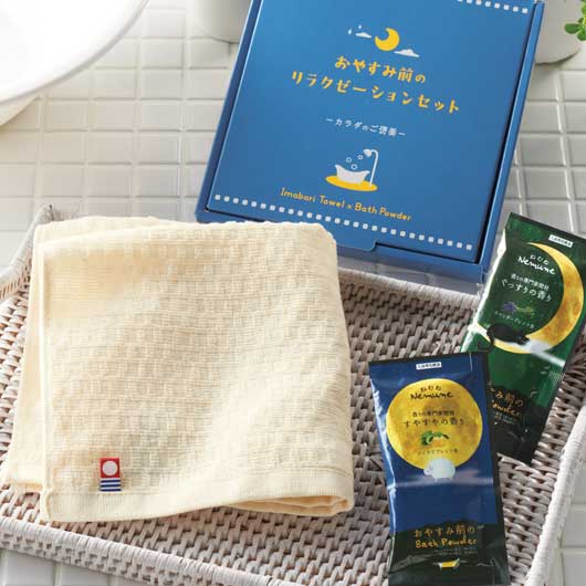 夢の世界へと誘うアロマの入浴料と柔らかな 今治タオルのセットで、お休み前の リラクゼーションタイムを満喫できるギフトです。