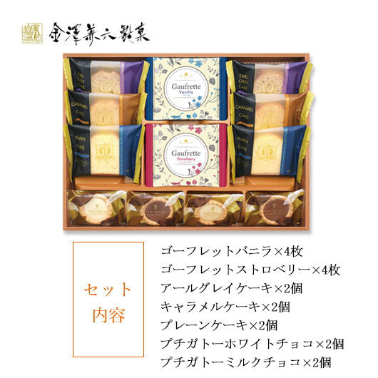 ●ゴーフレットバニラ×4枚、ゴーフレットストロベリー×4枚、アールグレイケーキ×2個、キャラメルケーキ×2個、プレーンケーキ×2個、プチガトーホワイトチョコ×2個、プチガトーミルクチョコ×2個(合計18個)