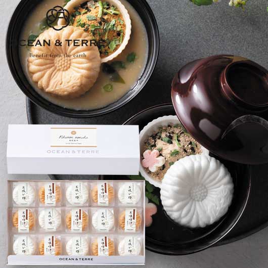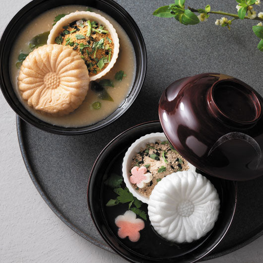 高貴で気品のある菊紋の最中に包まれた、お吸い物とお味噌汁。昔から愛されてきた日本の味を、食感の楽しい最中と共にお召し上がりください。
