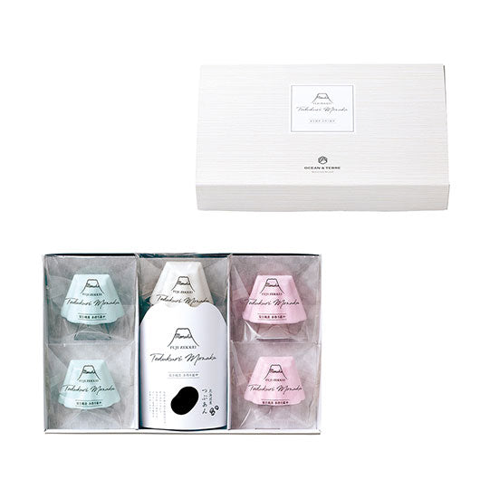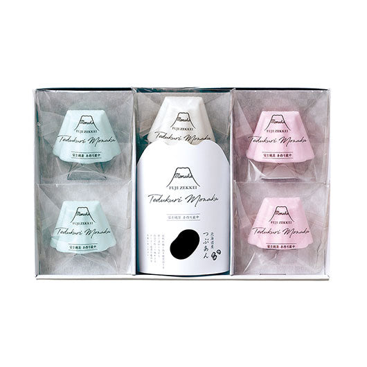 ●内容:FUJISAN最中(水色)1.85g×2、FUJISAN最中(白)1.85g×1、FUJISAN最中(赤)1.85g×2、粒あん35g×3※もち米100%(国産)最中種