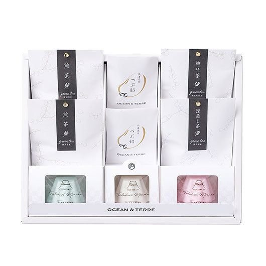 ●内容:FUJISAN最中(水色)1.85g×2、FUJISAN最中(白)1.85g×2、FUJISAN最中(赤)1.85g×2、粒あん35g×4、鹿児島県産 かぶせ茶ティーバッグ2g×10、静岡県牧之原産 深むし茶ティーバッグ2g×10、静岡県産 煎茶ティーバッグ2g×10×2 ※もち米100%(国産)最中種