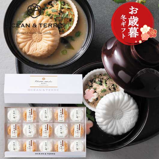 高貴で気品のある菊紋の最中に包まれた、お吸い物とお味噌汁。昔から愛されてきた日本の味を、食感の楽しい最中と共にお召し上がりください。