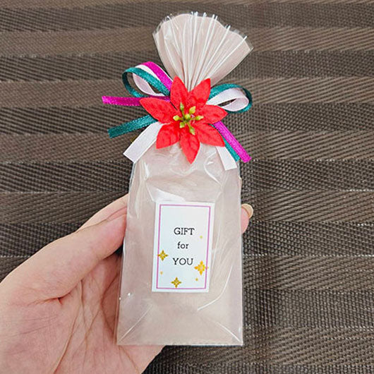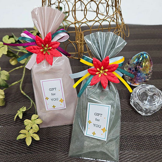 鮮やかなポインセチアと華やかなリボンをあしらった、クリスマス気分を盛り上げるプチギフトです。