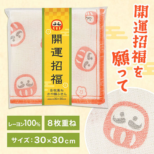 縁起の良いだるま柄をあしらった「開運招福」シリーズのかや織ふきんです。 受け取った方の幸運を願う気持ちが伝わるデザインです。 ふきんは汚れ落ち・吸水性・速乾性に優れたレーヨン100%素材。 30×30cmの使いやすいサイズ感で、贅沢な8層仕立てのため丈夫で長持ちします。 使い始めはぬるま湯でよく洗い、糊を落としてからご使用ください。 使うほどにやわらかくなり吸水性もさらに高まっていきます。 毎日の家事に役立ちながら長くお使いいただけるので、販促効果も持続。 縁起の良さと実用性を兼ね備えており、ご挨拶品や開店・周年祝い等のシーンにぴったりです。