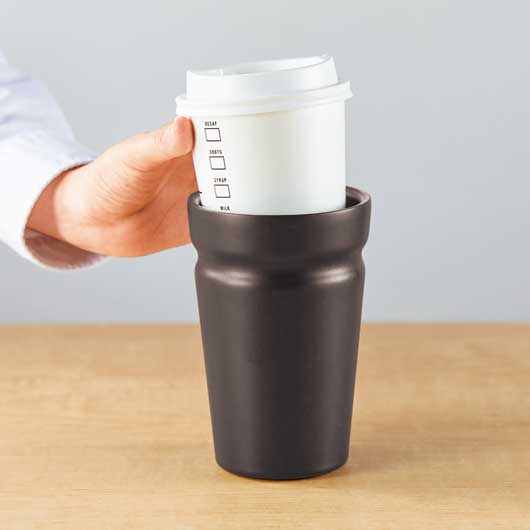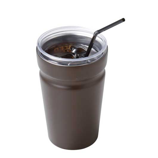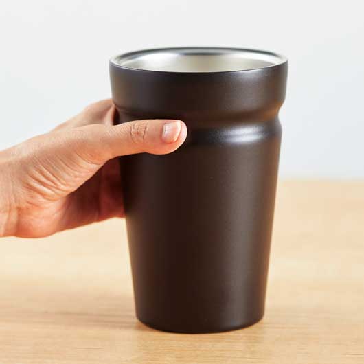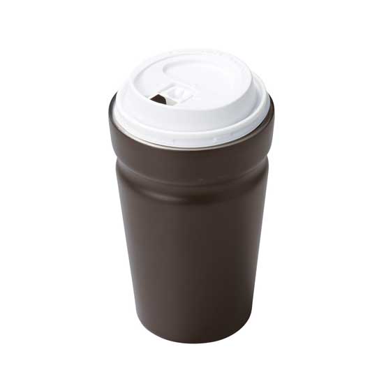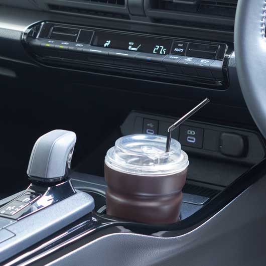 コンビニやコーヒーチェーン店のカップが入る、 真空二重構造のステンレス製タンブラー。 持ちやすい形状、車内ドリンクホルダー対応。