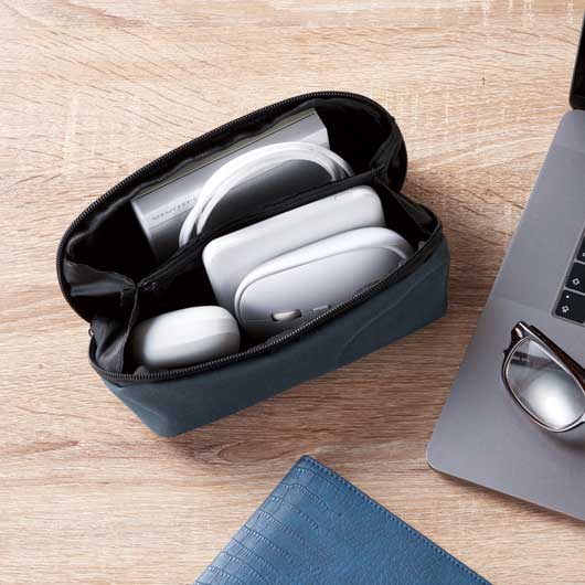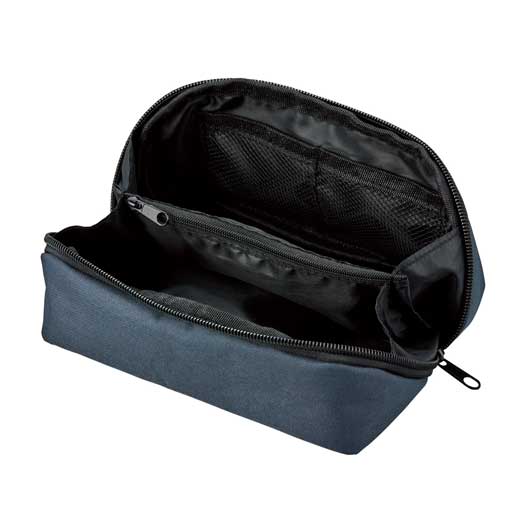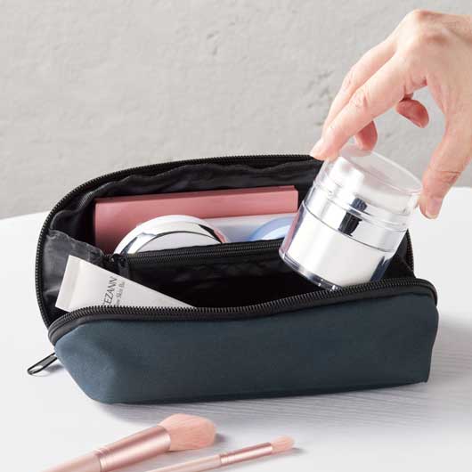 中身を確認しやすく取り出しやすい、 ガバッとフルオープンする構造のポーチです。 細かい小物を整理できるポケット付もポイント。