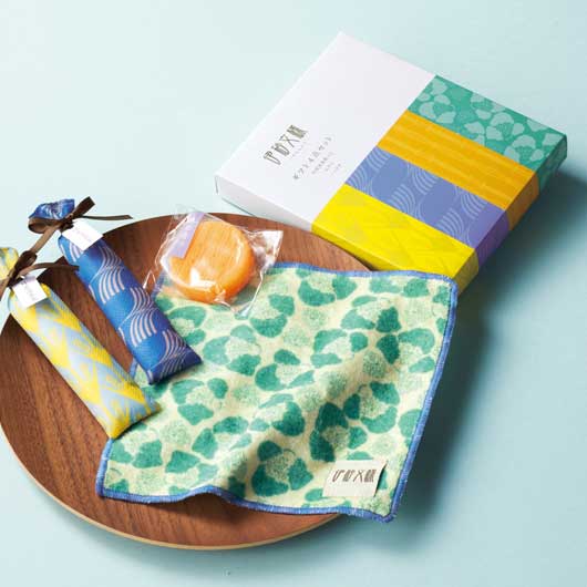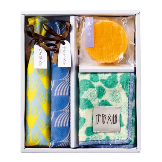 京都で生まれた伝統柄「伊砂文様」の版権商品。 竹炭消臭袋×2、爽やかな森の香りの固形石鹸、 綿100%ハンカチタオルの和柄ギフト4点セット。