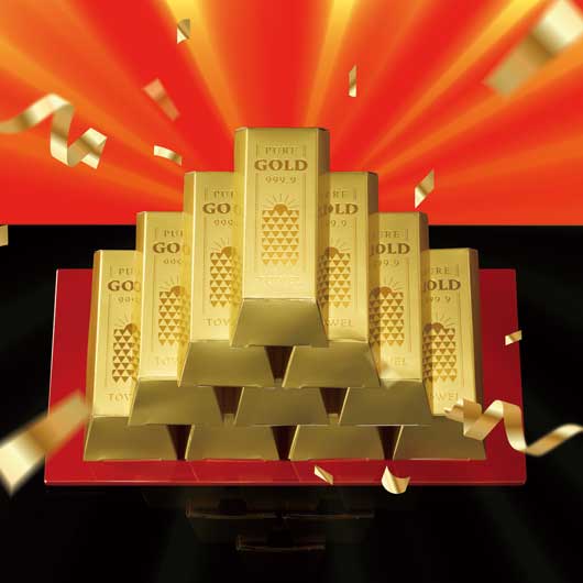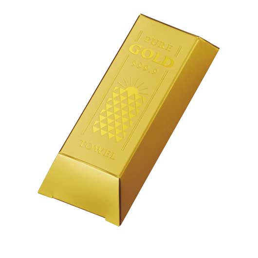 ゴールドバー風パッケージがディスプレイ映えし、 キラキラ光り高級感のある箔押しがポイント。 ふわふわ優しい手触りが嬉しいハンドタオルです。