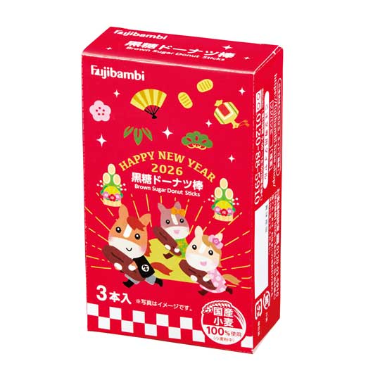 2026年の干支をモチーフにした化粧箱に 黒糖ドーナツ棒が3本入っている年末年始の 挨拶回りなどに最適なプレゼント品です。