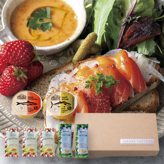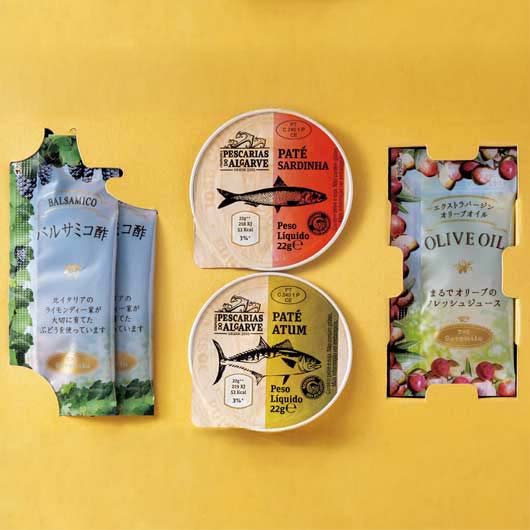 サディーン・パテ 22g×1、ツナ・パテ 22g×1、オリーブオイル 4g×3、バルサミコ酢 3.3ml×2