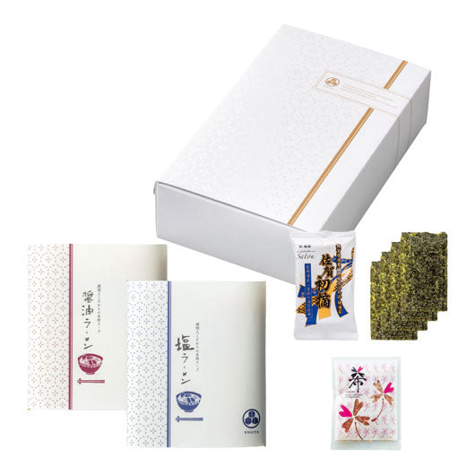 ラーメン(半生麺80g)×2、ラーメンスープ(醤油・塩)×各1、有明海産焼海苔4枚×1、鰹節3g×1