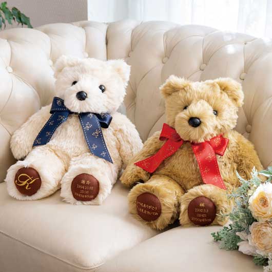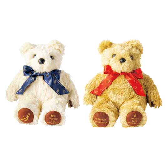 両足刺繍入りベア1体、右足 イニシャルもしくは定型文が入ります。左足 漢字の名 前・生年月日(西暦)・出生時間(24時間表記)・出生体重・出生身長(小数点第一位ま で )が 入 りま す 。 ※ウェイトベアの再現体重は4,000gまでとなります。(それ以上の場合はご相談ください。)