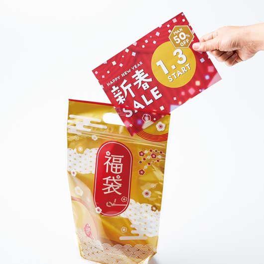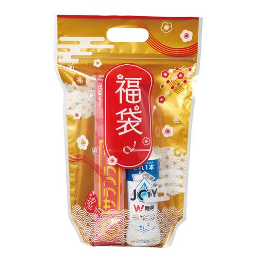●セット内容/サランラップ22cm×15m・除菌JOYコンパクト・ハローキッチンペーパー70枚・ジップロックフリーザーバッグM3枚・アイラップ60枚×各12個、めで鯛スタンド福袋×60枚
