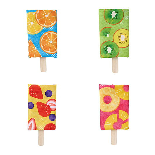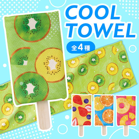 アイスキャンディのようなキュートな見た目が目を引くクールタオルです。 暑い季節の外出時に使いやすく、熱中症対策としても取り入れやすいアイテムです。 パッケージにはリボンのイラストをあしらい、ギフト感のある見た目にこだわっています。 本体の柄はパイナップル・オレンジ・キウイ・ストロベリーの4種アソート。 カラフルなので並べるだけでも映え、目を惹きやすいのもポイントです。 アイスの棒を模した台紙にはタオルの使い方を記載しており、初めての方でも迷わず使うことができます。 タオルは濡らして振るだけで冷たくなり、暑さ対策として活躍します。 首や頭に巻きやすい約18×90cmサイズ。 パッケージがジッパー袋のため、濡らした後でも収納しやすく、持ち歩きにも便利です。 水さえあればその場で使用できるため、夏のイベントや暑い時期の配布物として活躍します。