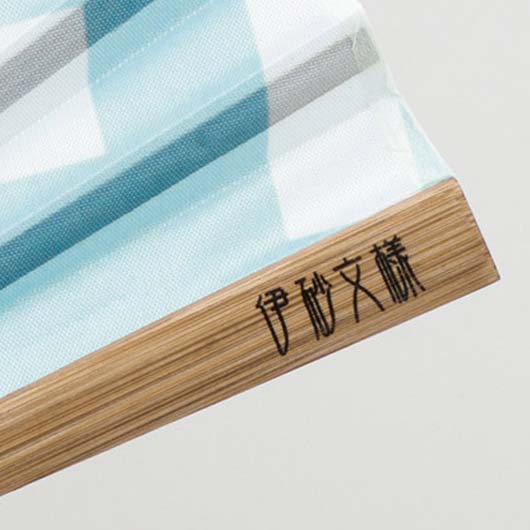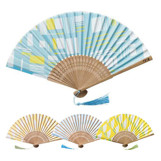 伊砂文様シリーズの新しい夏柄を使用した扇子。 涼しい色味と文様で構成されたモダン和柄に、 持ち手部分に伊砂文様のロゴとタッセル付き。