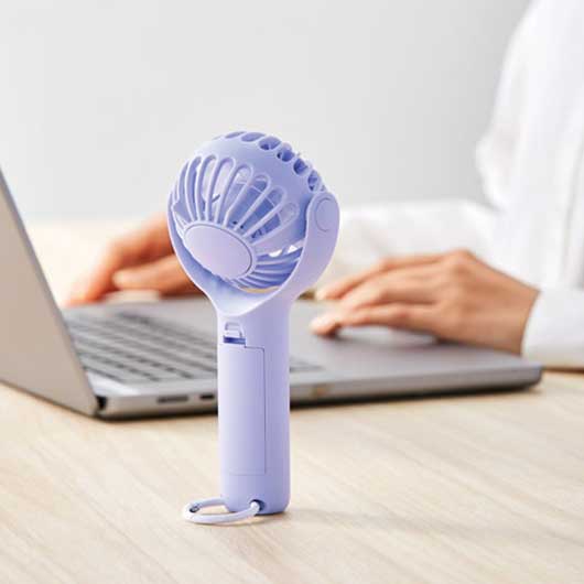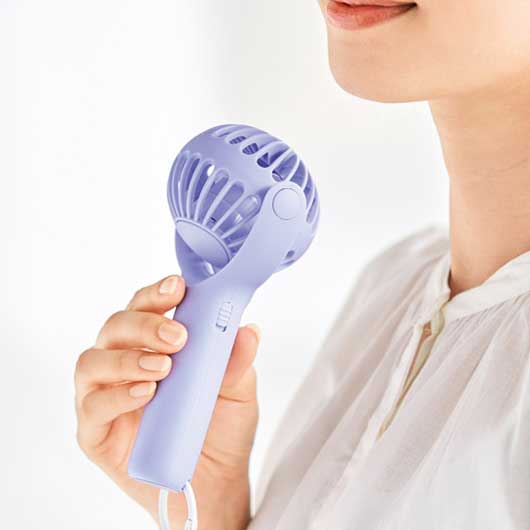 360度回転するヘッドで風向きを調整できます。 カラビナ付きで持ち運び時にも便利に使え、 底面滑り止め付き設計でデスクファンとしても。