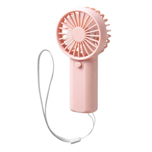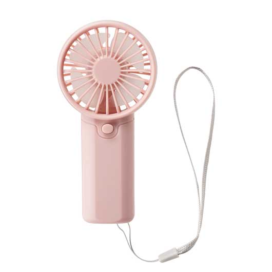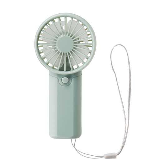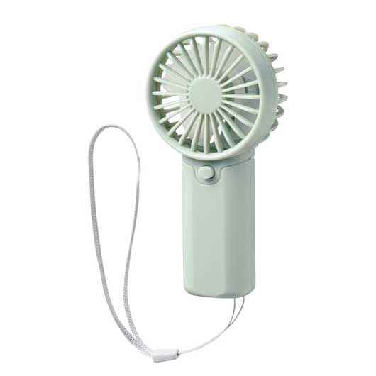 乾電池式のストラップ付ハンディファン。 持ち運びに負担が少ないコンパクト形状で、 流行りのくすみ系カラーがポイント。