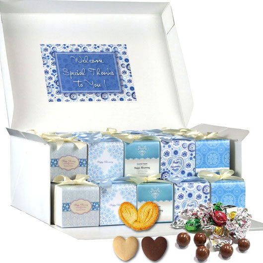 5種類のブルーの箱の中には、ハート型のクッキーとパイと