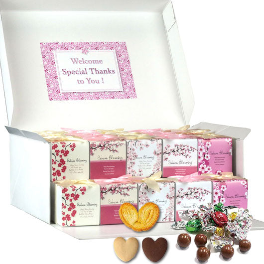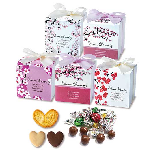 5種類のさくら柄の箱の中には、ハート型のクッキーとパイ、