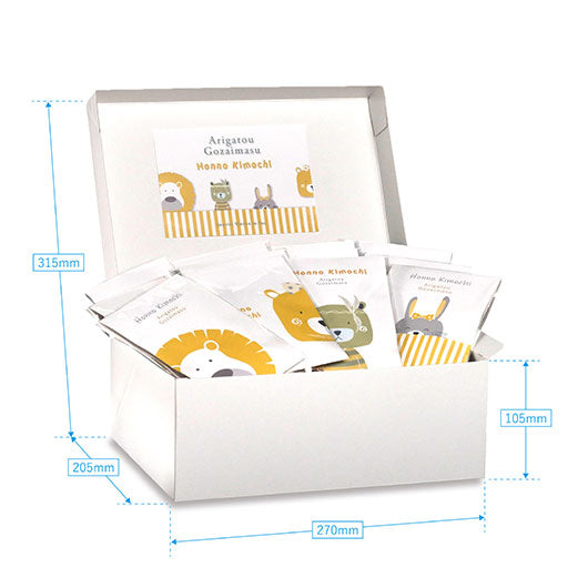4種類のアニマルデザインのパッケージの中には、ハート型のクッキーと紅茶を入れました。ハガキサイズの大きさで、見栄えもコスパも◎