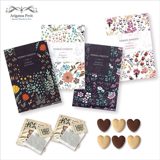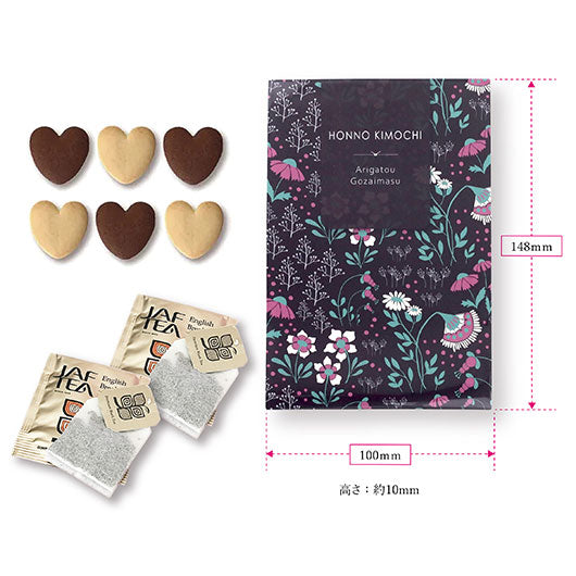 4種類の可愛いパッケージの中には、ハート型のクッキーと紅茶を入れました。ハガキサイズの大きさで、見栄えもコスパも◎