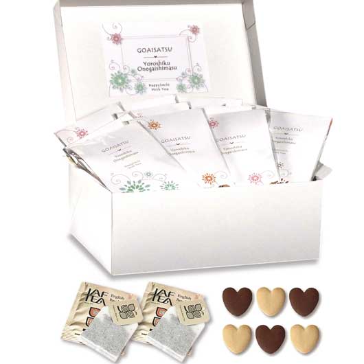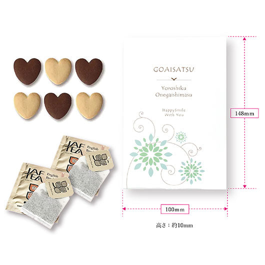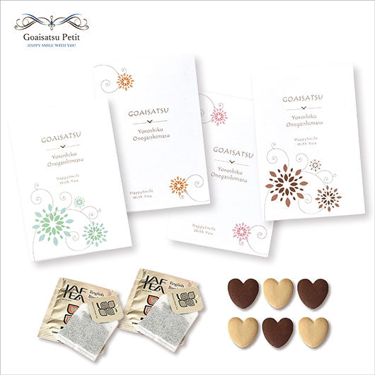 4種類の可愛いパッケージの中には、ハート型のクッキーと紅茶を入れました。ハガキサイズの大きさで、見栄えもコスパも◎