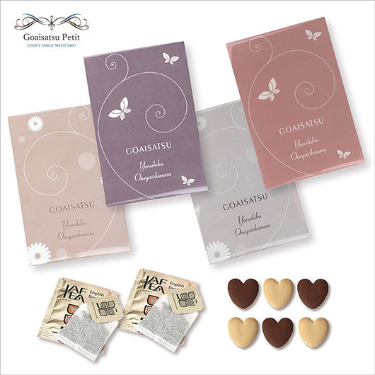 4種類の可愛いパッケージの中には、ハート型のクッキーと紅茶を入れました。ハガキサイズの大きさで、見栄えもコスパも◎